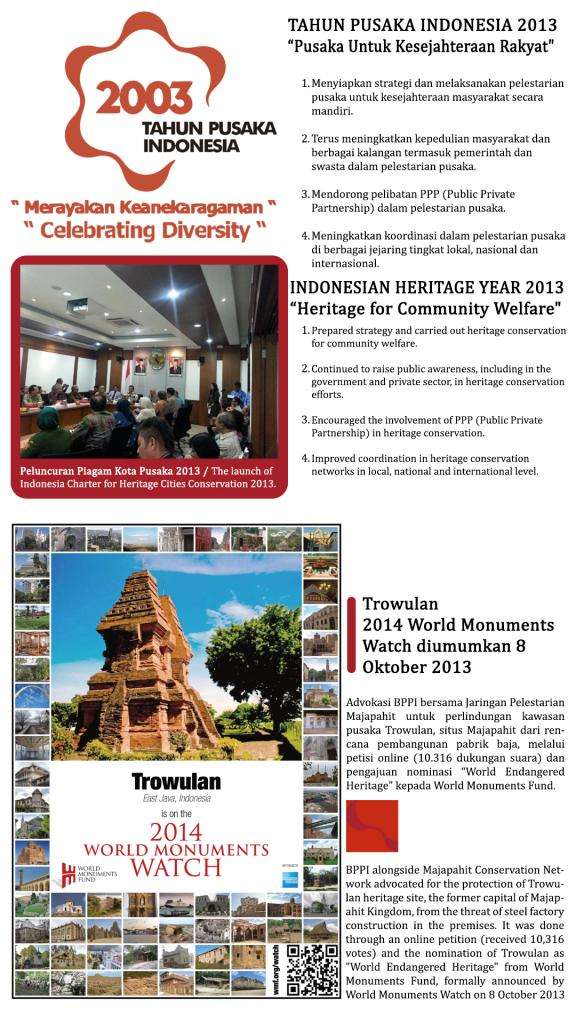 13. Advokasi BPPI bersama Jaringan Pelestarian Majapahit dan Yayasan ARSARI Djojohadikusumo untuk perlindungan kawasan pusaka Trowulan, situs Majapahit dari rencana pembangunan pabrik baja, melalui petisi online (10.316 dukungan suara) dan pengajuan nominasi “World Endangered Heritage” kepada World Monuments Fund